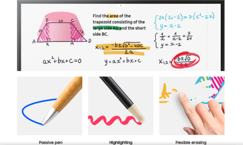 Samsung Flip 3 giúp phân biệt nội dung đầu vào để mô phỏng chính xác chữ viết xuất hiện trên màn hình hoặc làm nổi bật chúng để thu hút hiệu quả hơn. Lúc này bạn có thể xóa bỏ nội dung dễ dàng chỉ với thao tác vuốt ngón tay hoặc xóa nhanh bằng lòng bàn tay.
