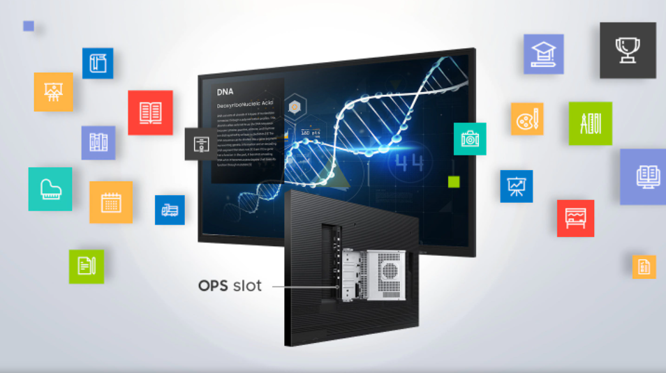 Bạn có thể thoải mái sử dụng các giải pháp giáo dục từ thiết bị thứ 3 và dễ dàng kết nối với hệ thống thông tin của trường học thông qua khe OPS được tích hợp sẵn. Việc sử dụng màn hình tương tác Samsung Flip 3 tương tự như được cung cấp một nguồn thông tin tập trung, hiển thị về lớp học, thông báo những sự kiện chính, đồng thời cảnh báo thời tiết để bạn dễ dàng cập nhật thông tin nhanh chóng.