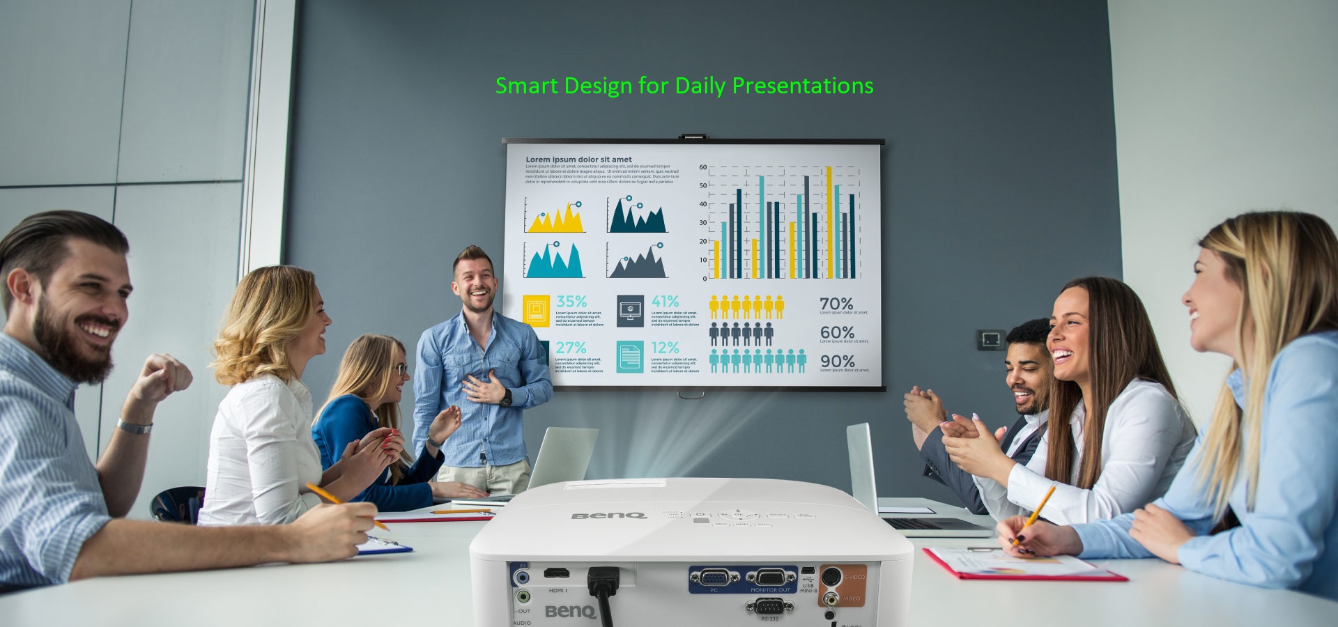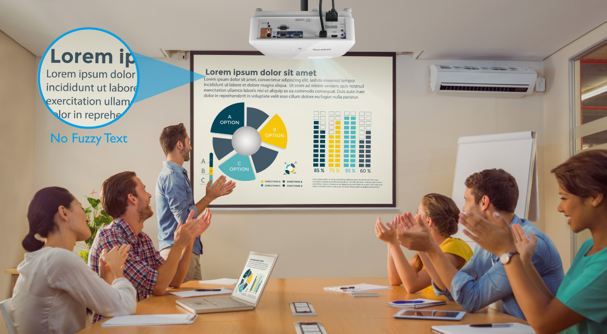 Với hệ số tương phản và hệ số điền đầy điểm ảnh đang dẫn đầu trong thị tường máy chiếu hiện nay, máy chiếu BenQ tạo ra màu đen chân thực nhất nên mọi ký tự, biểu đồ, đồ thị sẽ cực kỳ rõ ràng. Hệ số điền đầy điểm ảnh cao làm tăng độ rõ nét cho hình ảnh đen trắng hoặc màu sắc và giảm mỏi mắt cho người thuyết trình và khán giả để tập trung vào nội dung.