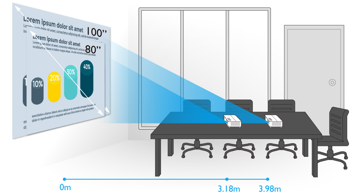 Chiếu hình ảnh lên tới 100 inch từ khoảng cách 3,98m. Dễ dàng chia sẻ công việc chuyên nghiệp của bạn trong phòng họp nhỏ / vừa mà không gặp khó khăn trong việc lắp đặt không gian cho máy chiếu.