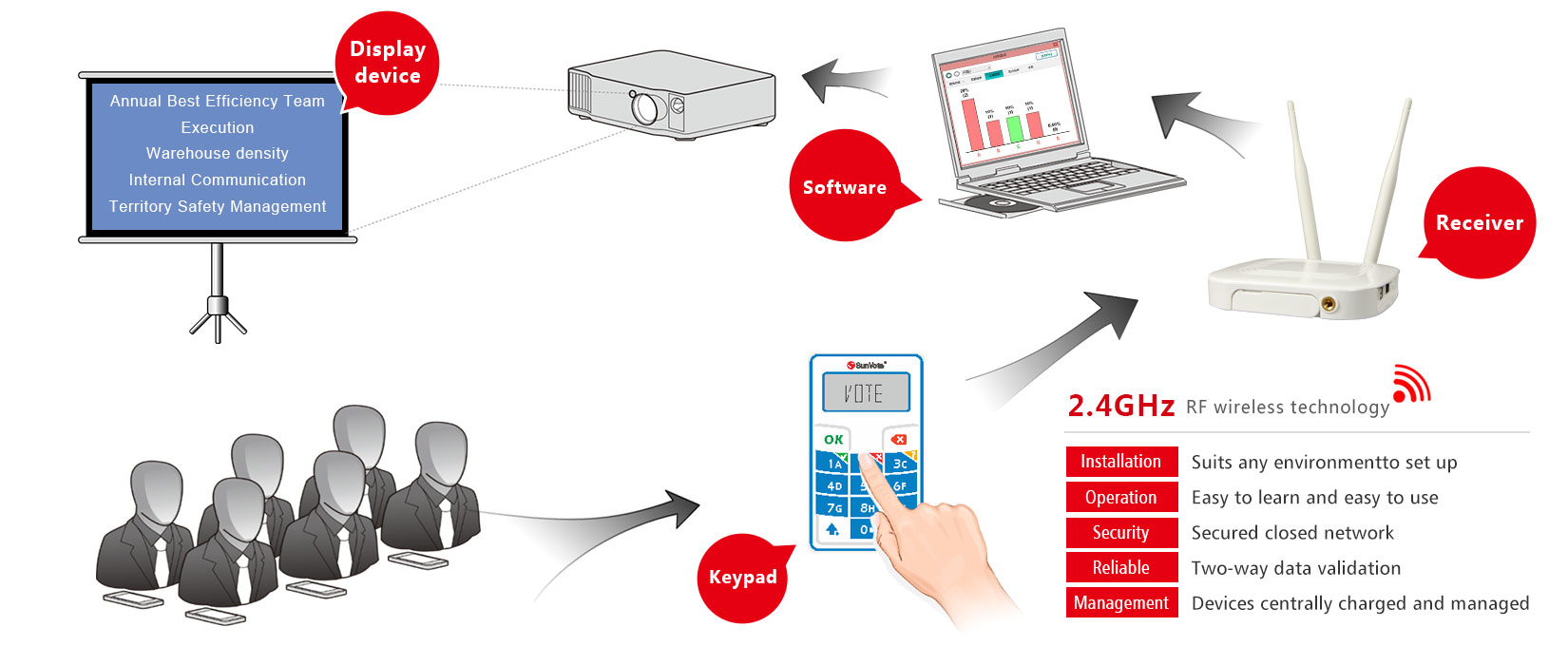 Với phạm vi cho phép lên tới 100m thiết bị trả lời trắc nghiệm SunVote có thể sử dụng trong những môi trường phòng học lớn nhỏ hay những hội trường rộng. Một bộ thiết bị trung tâm có thể hỗ trợ lên tới 400 thiết bị con – hay chính là thiết bầu cử (trả lời trắc nghiệm); đây quả là một sự lựa chọn tuyệt vời cho các cuộc thi.