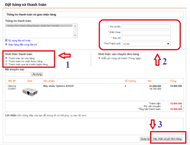 - Số 1: Tiếp theo, bạn lực chọn hình thức thanh toán trong 3 hình thức trên. Trường hợp bạn nhận được Mã khuyến mại từ việc đăng ký nhận tin khuyến mại trên Website, bạn điền vào ô Mã khuyến mại, sau đó bạn click vào Số 3: "Xác nhận và gửi đơn hàng"