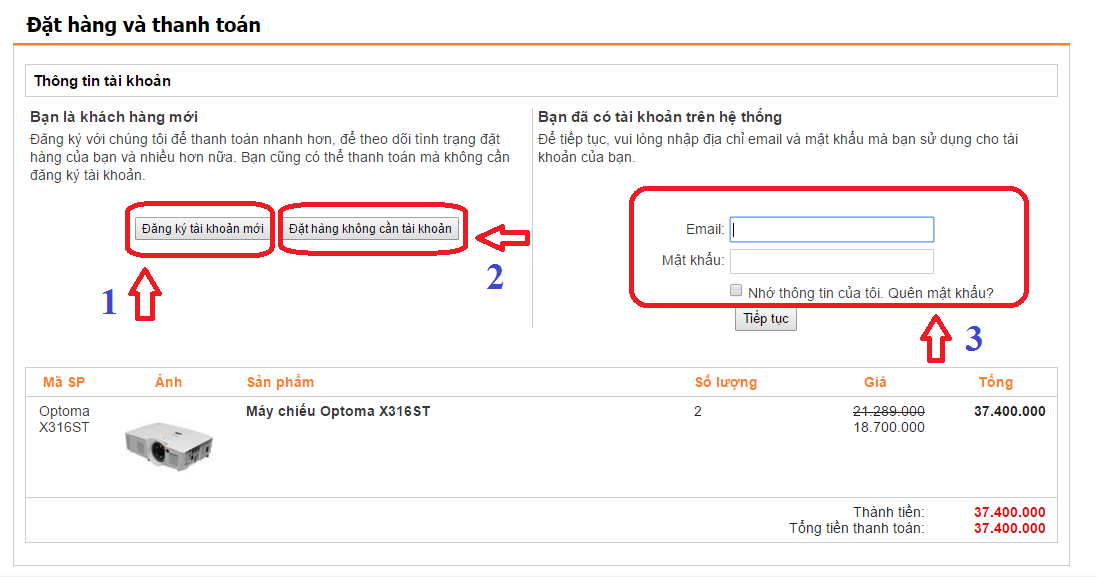 - Số 1: Nếu bạn là khách hàng mới, bạn click vào "Đăng ký tài khoản mới", mọi thông tin về đơn hàng sẽ được cập nhật và gửi về tài khoản của bạn.